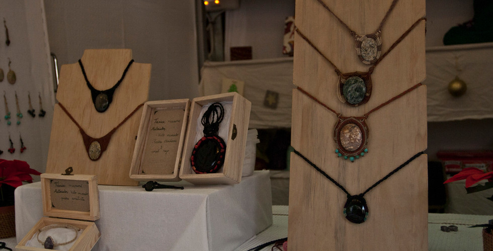 Marga empezó a hacer artesanía en sus años de estudiante de Antropología en un taller de encuadernación artesanal en Tarragona. Cuadernos, agendas, álbumes y blocs empezaron a tomar forma. Años más tarde, Marga obtendría una beca que la llevaría a Costa Rica y viajando por Centroamérica conoció a Leo, un artesano y viajante mexicano. De la unión de sus manos nació Alucinarte Artesanías, y Marga sumó a sus encuadernaciones artesanales los trabajos con piedras naturales y macramé que actualmente completan su “oficina”, como cariñosamente llaman a los lugares en los que podréis encontrarla en la calle, ya sea en el rastro o en los distintos mercados en los que participa. Durante estos años, Alucinarte Artesanías ha viajado por Centroamérica, Sudamérica, Asia, Marruecos y Europa, y, sin dudas, las manos de esta jerezana y este mexicano traducen toda esta memoria en sus trabajos.